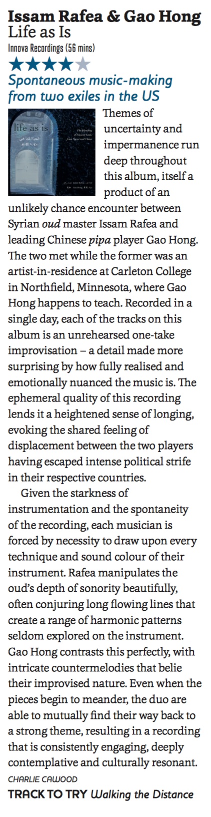 Given the starkness of instrumentation and the spontaneity of the recording, each musician is forced by necessity to draw upon every technique and sound colour of their instrument. Rafea manipulates the oud’s depth of sonority beautifully, often conjuring long flowing lines that create a range of harmonic patterns seldom explored on the instrument. Gao Hong contrasts this perfectly, with intricate countermelodies that belie their improvised nature. Even when the pieces begin to meander, the duo are able to mutually find their way back to a strong theme, resulting in a recording that is consistently engaging, deeply contemplative and culturally resonant.