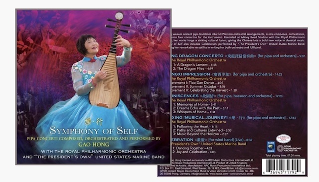 Symphony of Self 《樂·行》, Gao Hong’s latest album, features four original pipa concertos recorded at Abbey Road Studios with the Royal Philharmonic Orchestra, along with a live recording of her composition Celebration for wind band, performed by The President’s Own United States Marine Band. The album was released worldwide by Naxos World on January 23, 2026, and was awarded two Gold Medals from the Global Music Awards for Composition/Composer and Instrumentalist. A sold-out live concert celebrating the album took place at Temple Church in London on January 17 at 7:30 pm.