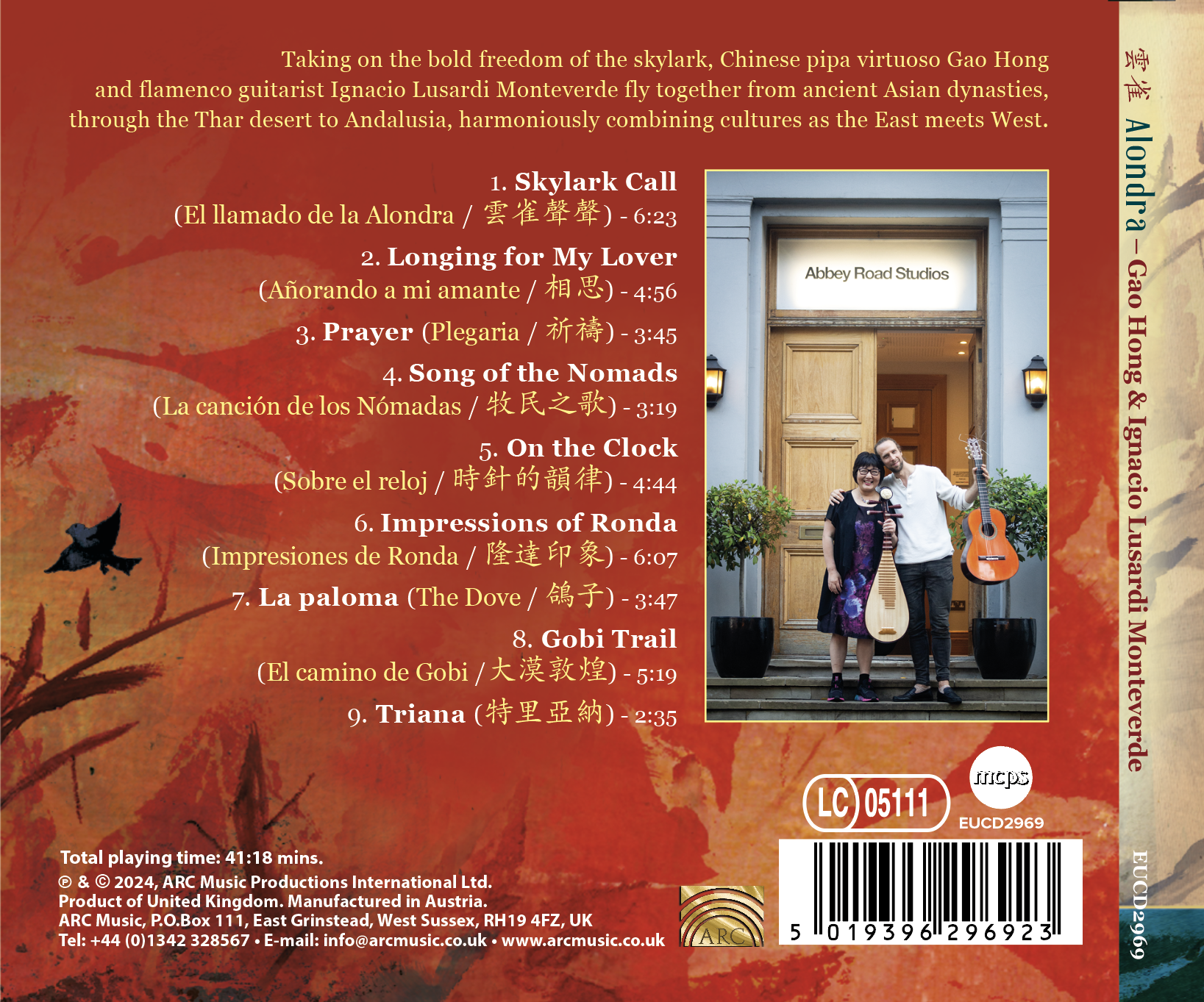 A unique duo collaboration between Chinese pipa virtuoso Gao Hong and Argentine flamenco guitarist Ignacio Lusardi Monteverde, the beautiful album "Alondra" blends music from both ends of the Eurasian continent. Influenced by jazz, flamenco, Argentine music, and Chinese music, the album offers a diverse range of performances.